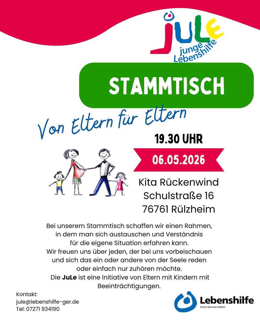 Unsere juLe lädt zum nächsten Stammtisch am 6. Mai 2026 um 19.30 Uhr in der KiTa Rückenwind in Rülzheim ein.
